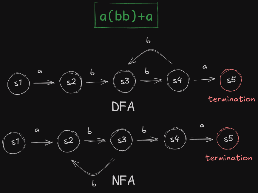 Issue with the first algorithm is precisely this exponential blow-up in stages, and issue with the second algorithm is exploring multiple paths. A DFA is like a look-up table, whereas an NFA is like a recursion problem where you have to backtrack and explore multiple paths. With an NFA, you cannot say that there's a match or there's no match without trying all possible paths. If you encounter a match early, good for you - or you'll be stuck trying paths again and again for a long time. At the same time, constructing an NFA is easier than constructing a DFA - NFAs are easier to understand and express the Regex pattern in a way that's very intuitive and easy to understand. Just see the above example.