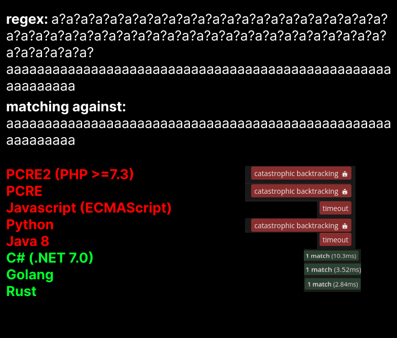 With that we draw to an end. Regular expressions represent a fascinating intersection of theoretical computer science and practical programming. Whether you're writing a simple validation script or designing a large-scale text processing system, knowing the potential performance implications of your regex can mean the difference between an elegant solution and a potential system vulnerability. The differences in implementations of regex engines across languages shows that there's still significant innovation possible in how we approach pattern matching and text parsing using regex. Few might argue that the article cherrypicks bad examples to prove the most common implementations wrong - however, given between two implementations, one that works fine for most and has a backup for one specific feature and one that is error-prone and caters to all features, what would you prefer? Note that we aren't talking about minor errors, we're talking about errors that can bring down entire systems. Thanks for staying till the end fellow reader :)